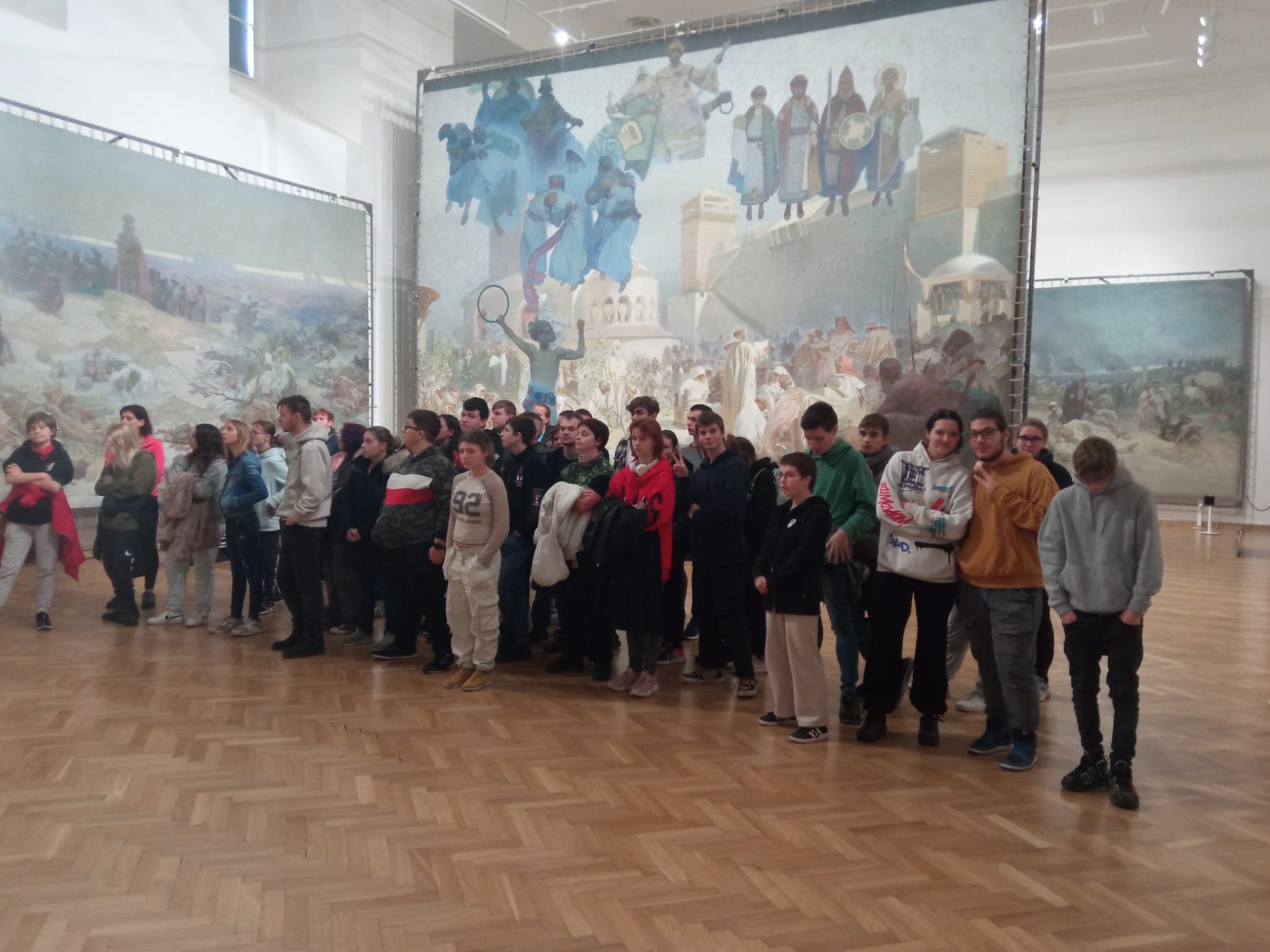 První zastávkou byla slavná Slovanská epopej, cyklus monumentálních obrazů od Alfonse Muchy. Žáci si mohli prohlédnout všech 20 děl, která zobrazují klíčové momenty a příběhy slovanské historie. Průvodce obohatil prohlídku zajímavými fakty o Muchově práci, jeho inspiraci a významu jednotlivých maleb. Atmosféra v galerii byla podmanivá a mnozí žáci ocenili, jak obrazy dokážou vyprávět příběhy pouhými tahy štětce.